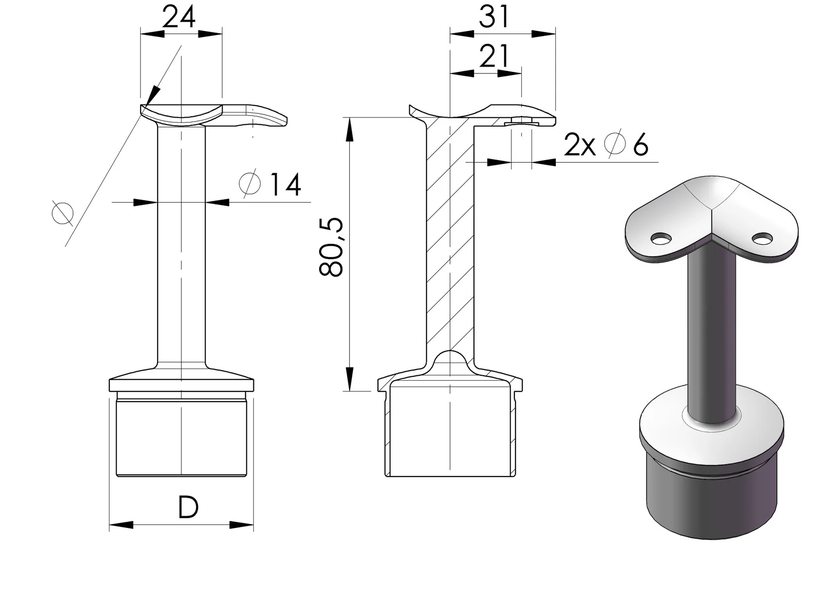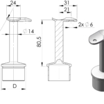 Support main courante haut 80.5mm pour tube 42.4mm plateau fixe tige soudée inox 304